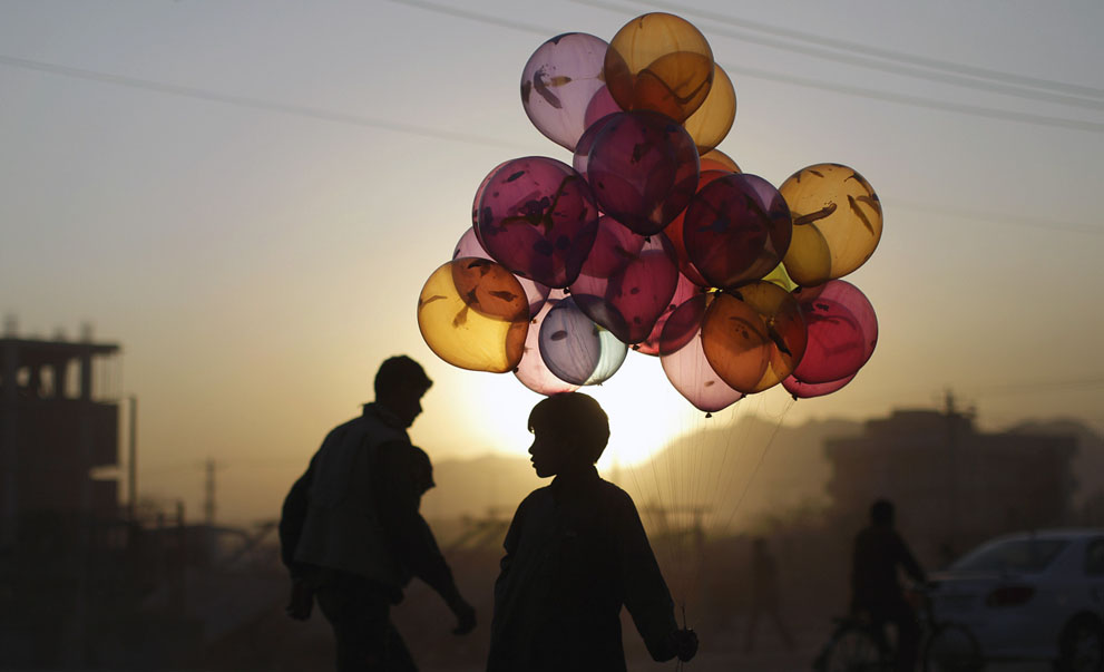 Mahfouz Bahbah, 12, stands on a roadside hoping to sell his balloons during sunset in Kabul, on October 18, 2011. (AP Photo/Muhammed Muheisen)