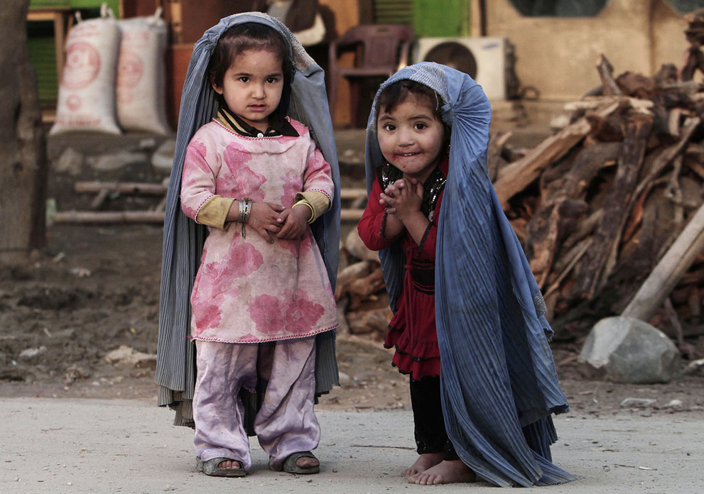 Two young girls play house, mimicking their mothers in burqas cut to their size, on the outskirts of Jalalabad, east of Kabul, on March 17, 2013. (AP Photo/Rahmat Gul)