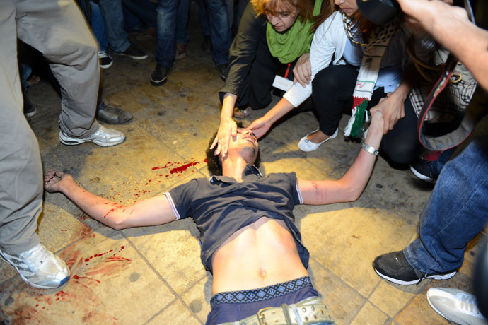 Protesters help an injured person during a demonstration on August 2, 2013 in Rabat-Morocco on the release of a Spanish paedophile, Daniel Fino Galvan who raped 11 local children was pardoned by the Moroccan King Mohammed VI. AFP PHOTO / FADEL SENNA