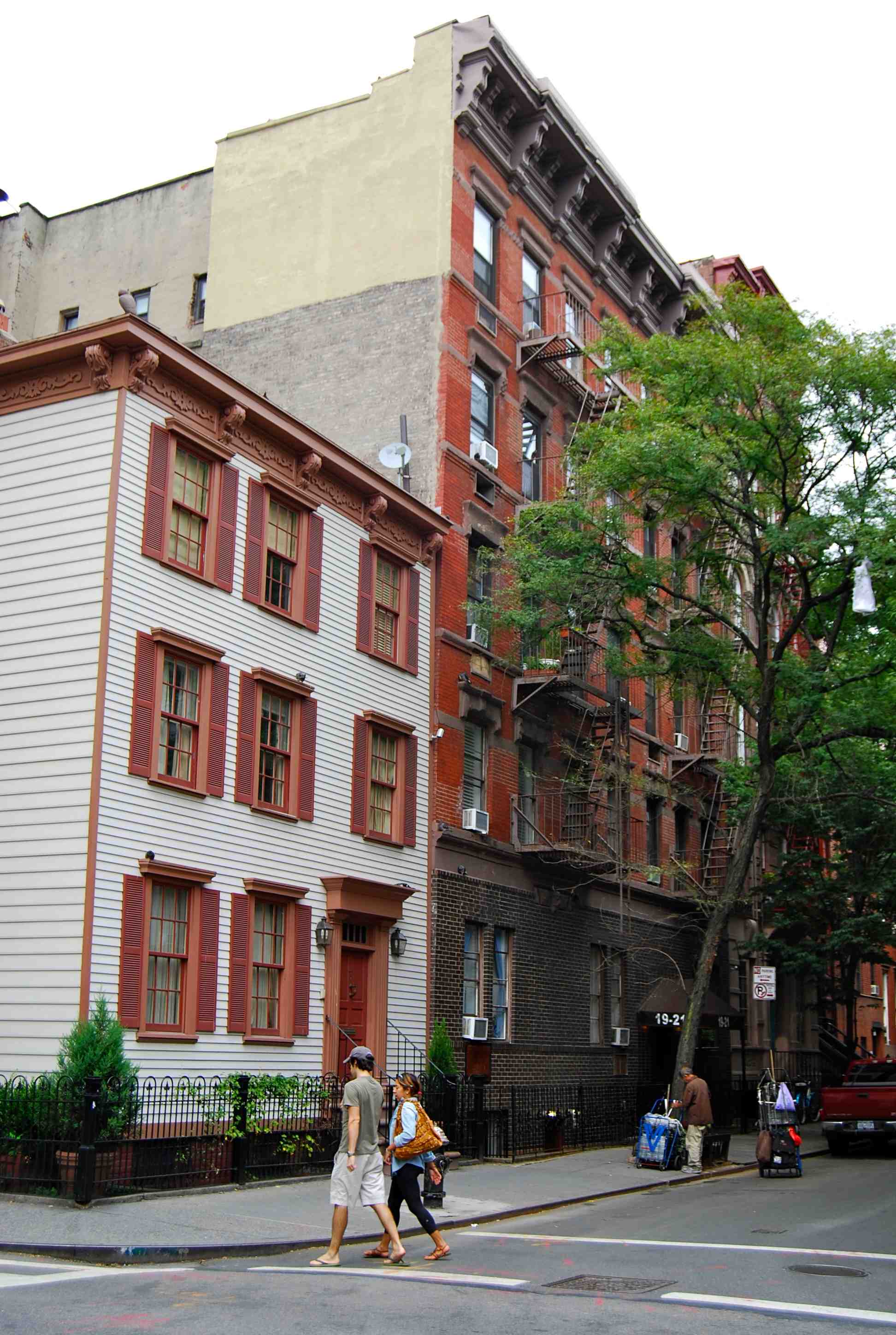 Last wooden house in the West Village on the left; Ross from Friends apartment block on the right