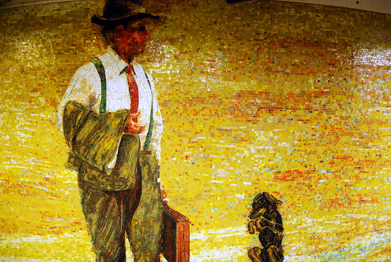 Man contemplates escaping the grind and running away to the circus — ‘The Garden of Circus Delights’, by Eric Fischl, 2001, Glass mosaic