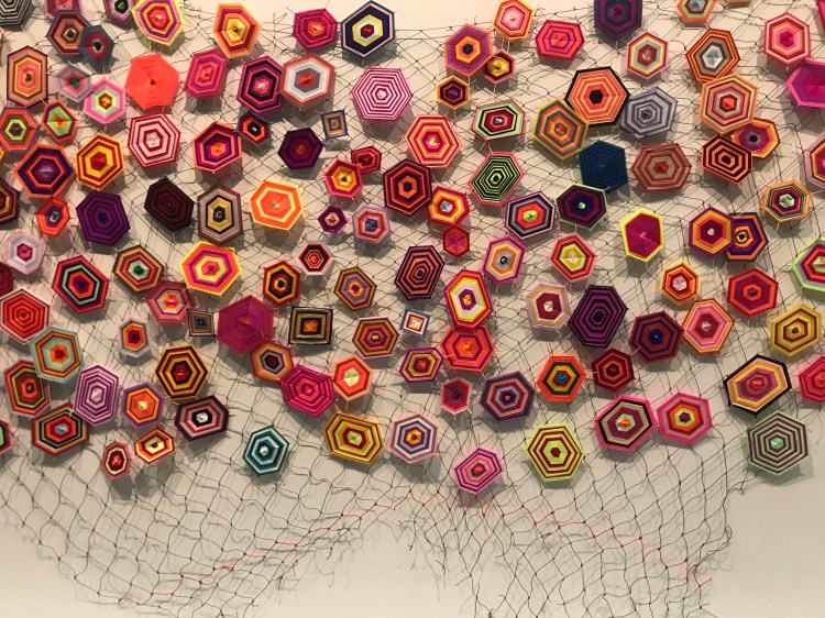 Akay Koo’oila Women’s Art Centre Artists, Aurukun, ‘God’s eye installation’, 2017. ‘This installation was made by 45 women of Aurukun who would gather at the centre each day to work and share stories. The creation is a symbol of peace, comfort and healing’.